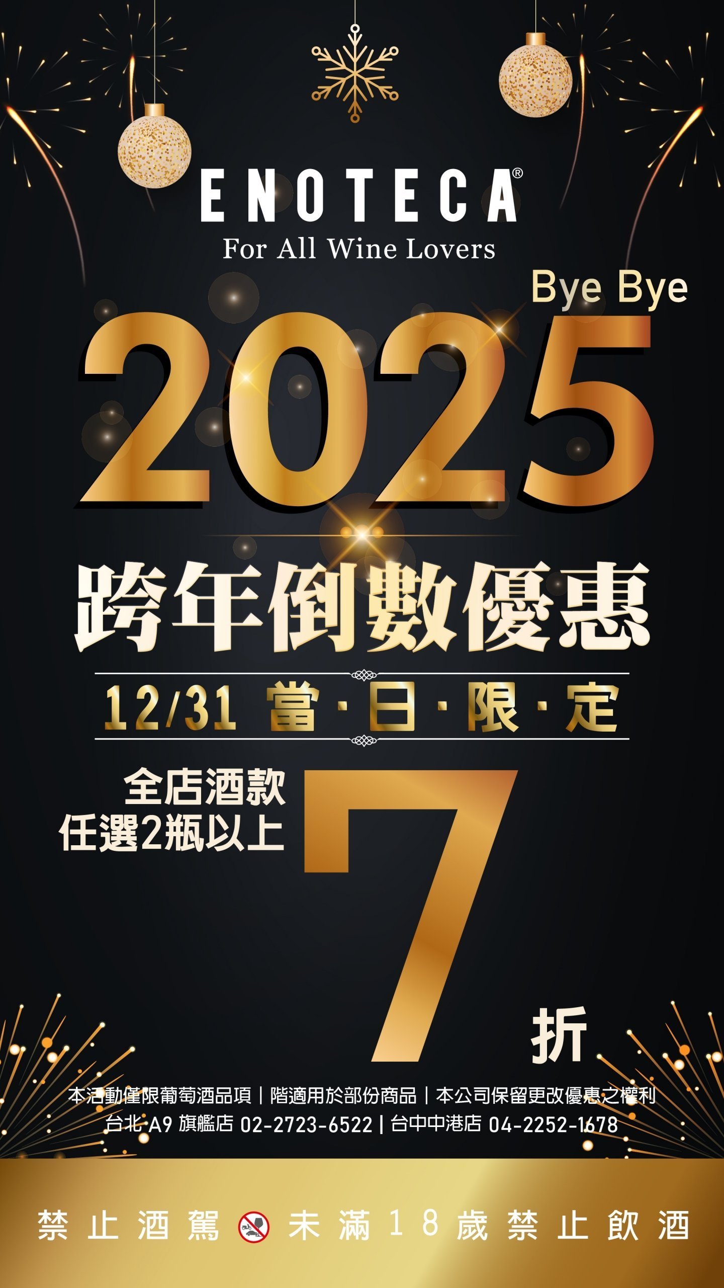 2025.12.31(三)|One Day Only全店葡萄酒款,任選兩瓶(含)以上,即享 7 折優惠。