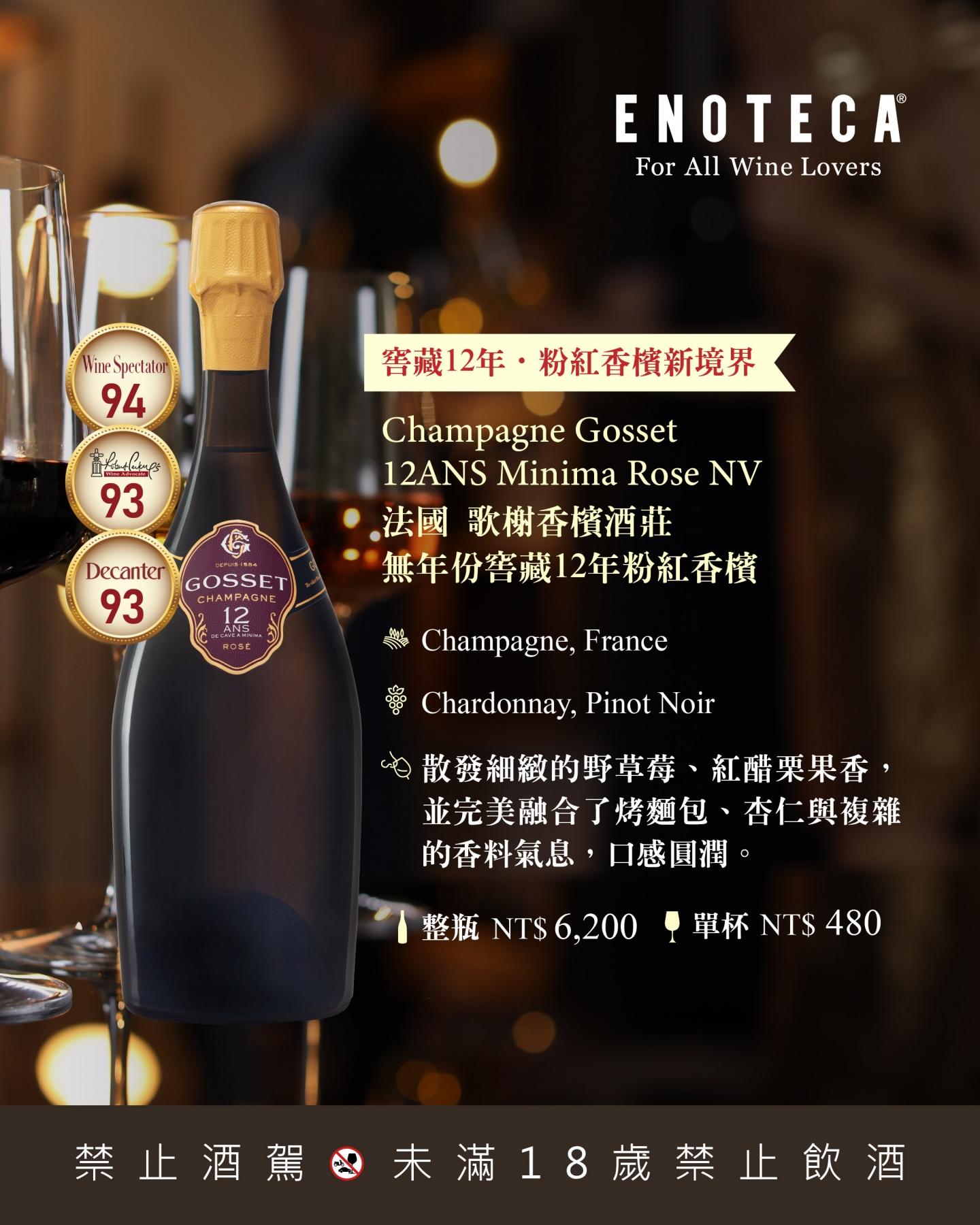 創立於1584年的Gosset是香檳區歷史最悠久的酒莊之一,以不經乳酸發酵的傳統工藝聞名。此款「無年份窖藏12年粉紅香檳」延續酒莊對時間與結構的堅持,歷經長時間瓶中熟成,遠超法定規範,展現非凡的深度與細膩層次,被譽為粉紅香檳的新高度。