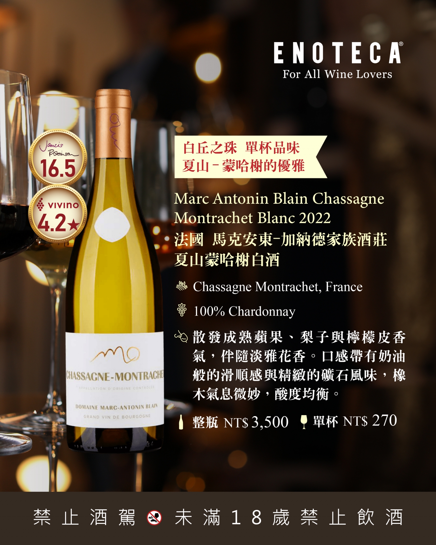 出身布根地名門Blain-Gagnard家族,Marc Antonin是夏山-蒙哈榭新生代的代表之一。酒款忠實呈現產區的礦物優雅與細緻結構,被視為經典白丘風格的延伸,兼具傳統與年輕釀酒師的現代感。