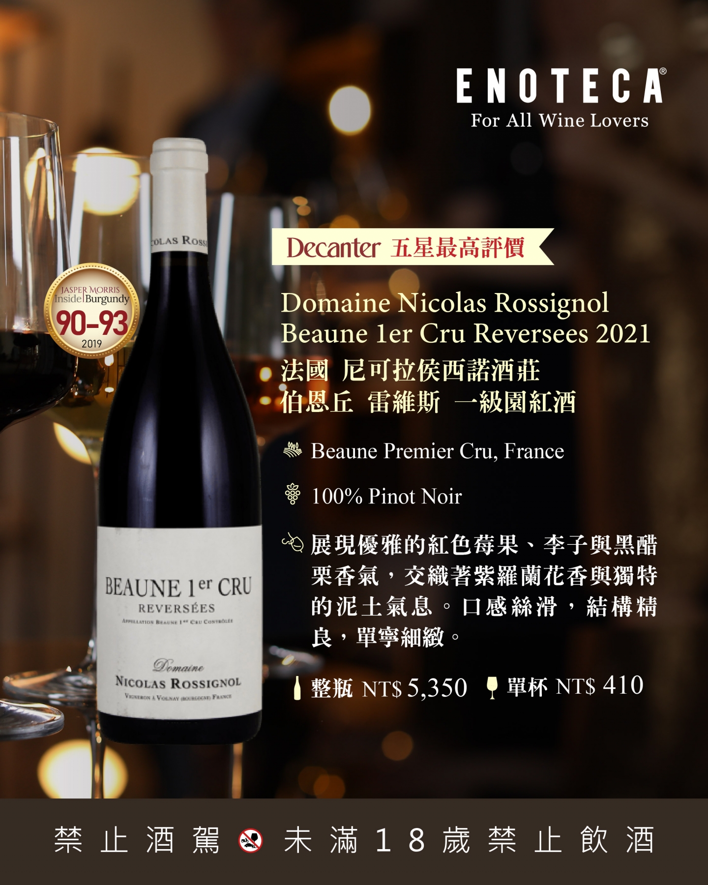 Nicolas Rossignol,布根地伯恩丘 (Beaune) 的Volnay產區備受矚目的釀酒師,於 1997 年成立同名酒莊。他專注於展現風土,釀造精緻的黑皮諾。此款來自伯恩一級園「Reversees」,以細緻結構與優雅力量著稱,是酒莊風格與伯恩丘魅力的完美展現。